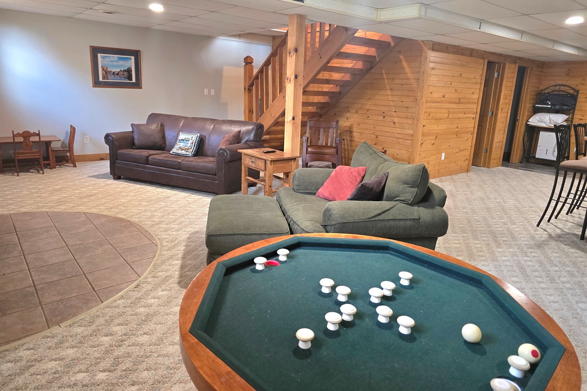 Down the open staircase there is a large den/game/sleeping area with a stone wood burning fire place with a flat screen tv on the mantle and a sectional couch. There is a 4 place dinette set and a bar with 3 chairs. Behind the bar area is open shelving with lots of books and games. The game area has a futon couch, foosball table and arcade games. On the back side of the open stair case are 2 queen size bedrooms and a full bath with shower. Next to the full bath is a door that leads up the stairs to the garage area.